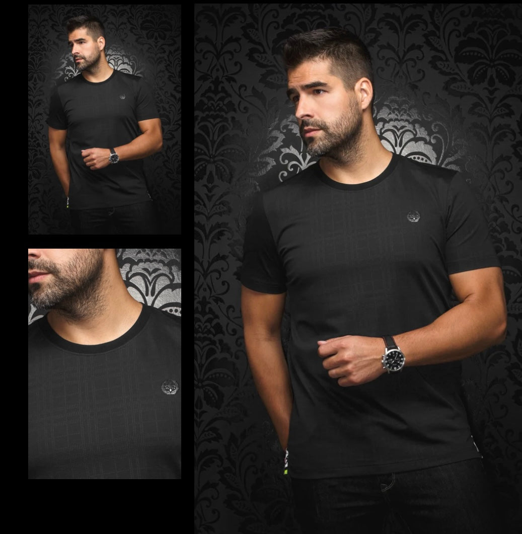 100% Pima cotton Men’s crewneck T-shirt. In a black with line design in black.