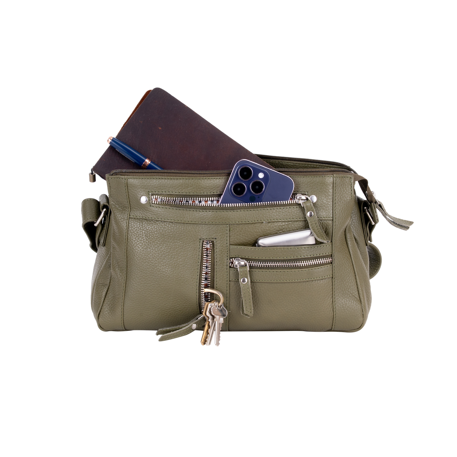 Green Wood Leather Crossbody Bag – Stylish, Functional & Time