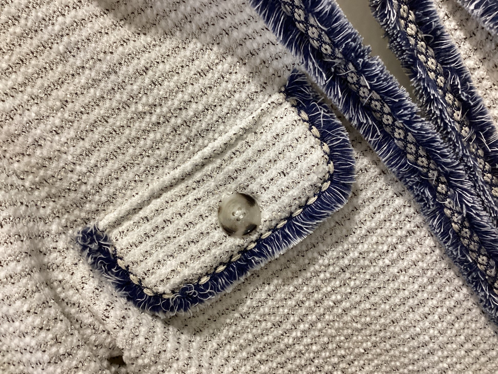 Coco Channel like....This collarless jacket with fray details is formal as well as great with jeans. The color combination is a classic - navy and cream - Boucle