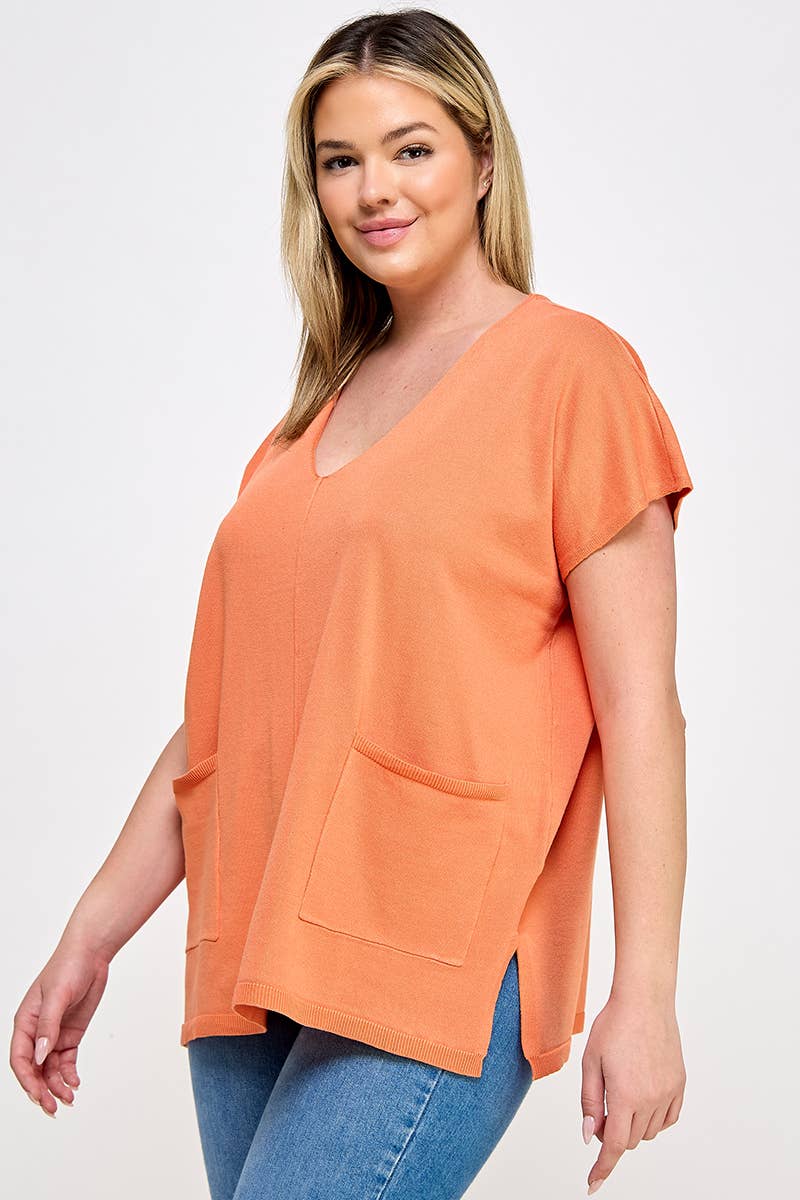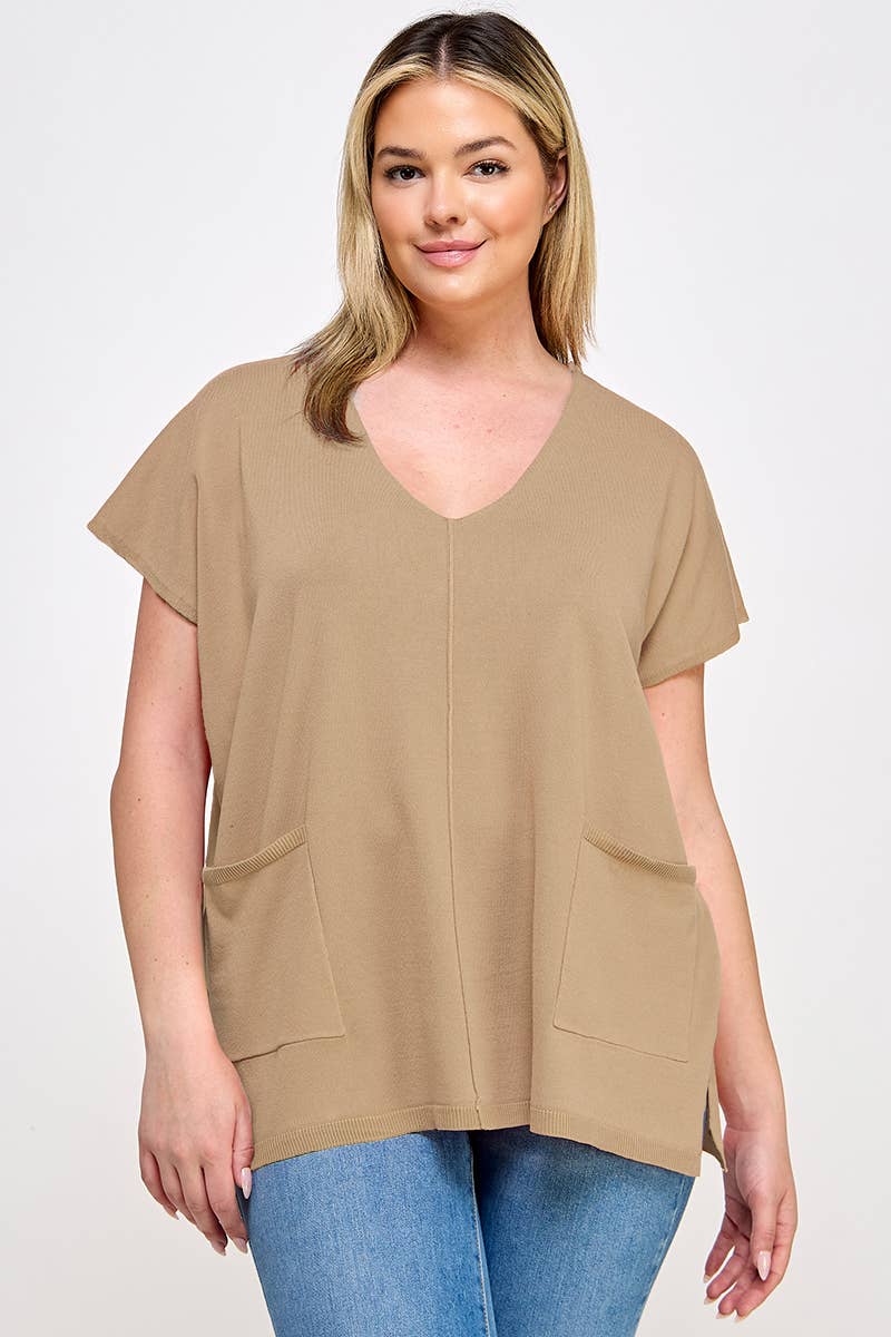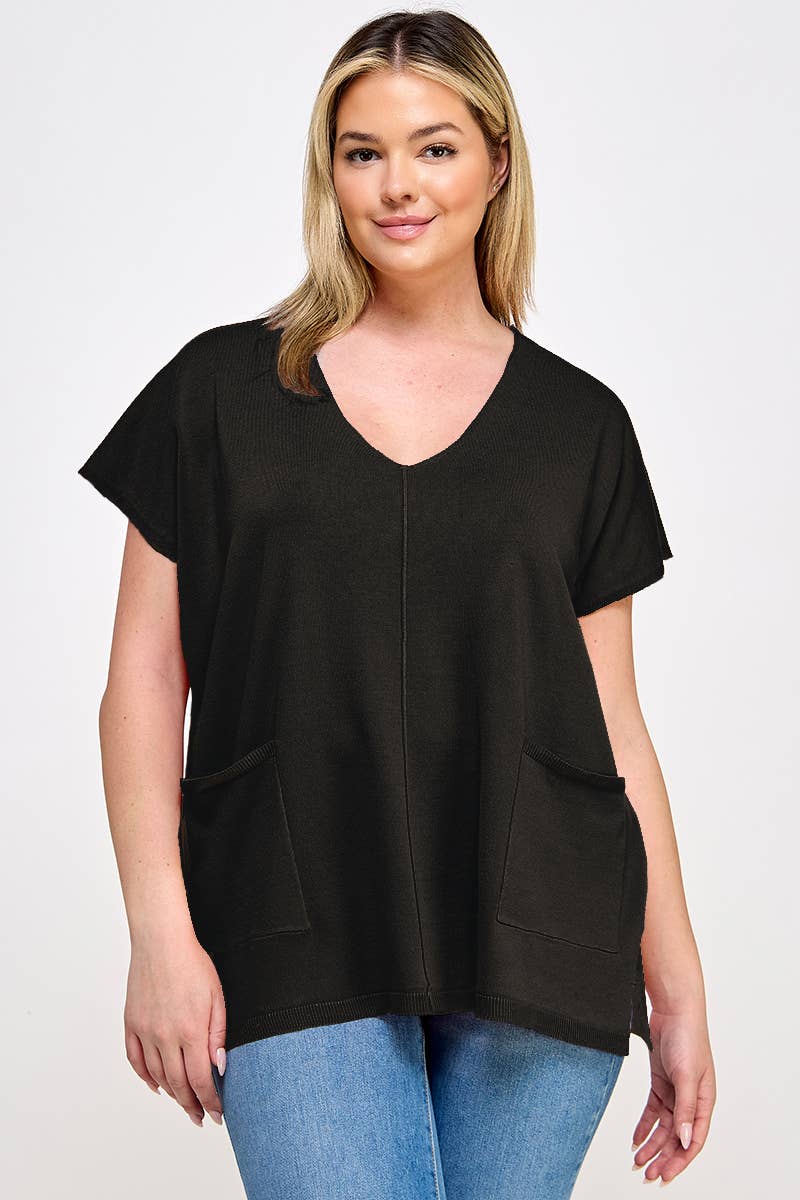 Plus Size Short Sleeve Sweater Knit Top With Pockets CL2473P